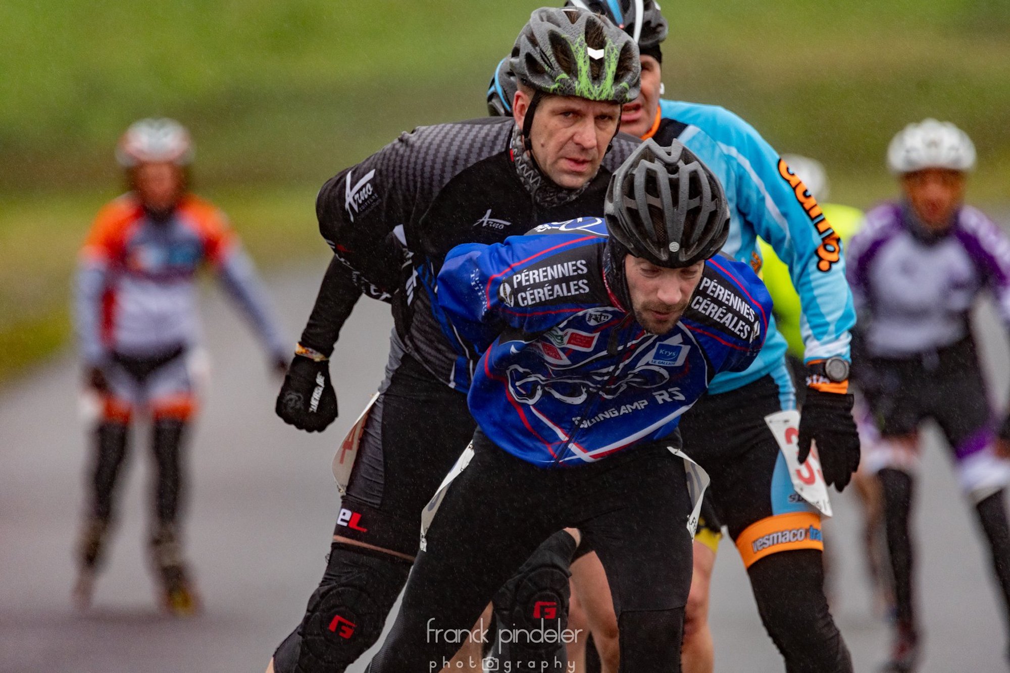 Départ à 9h00 du matin pour le marathon vétéran. Ainsi, Benoit, Xavier et Mickaël ouvrent le bal de la journée, tôt le matin, à la fraiche, sous une petite pluie bien désagréable et un vent très soutenu… La course de déroule sur un superbe circuit automobile à piste bien trempée, comportant une très longue ligne droite, où l’on retrouve le vent de face. Donc, interdiction d’être seul, sous peine de galère…